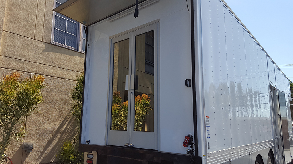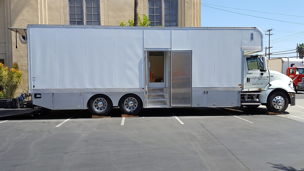 This vehicle is designed for Camera Departments. The trailer includes: jockey box, storage cupolas, dual side and back loading. Trailer comes with an extra large lift gate, air-ride and automatics. This unit's office also includes custom storage, a built-in MP3 stereo system, and a skylight.
