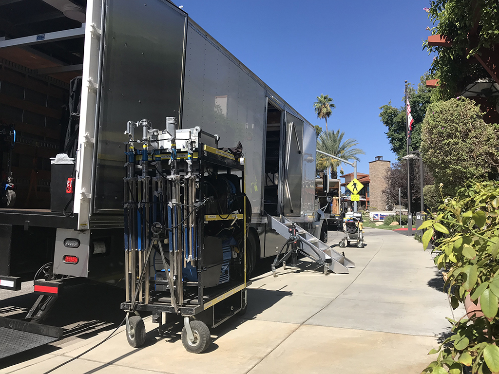 This vehicle is designed for Grip, Lighting & Electric Departments. The trailer includes: jockey box, storage cupolas, dual side and back loading. Trailer comes with an extra large lift gate, air-ride and automatics. This unit's office also includes custom storage, a built-in MP3 stereo system, and a skylight.