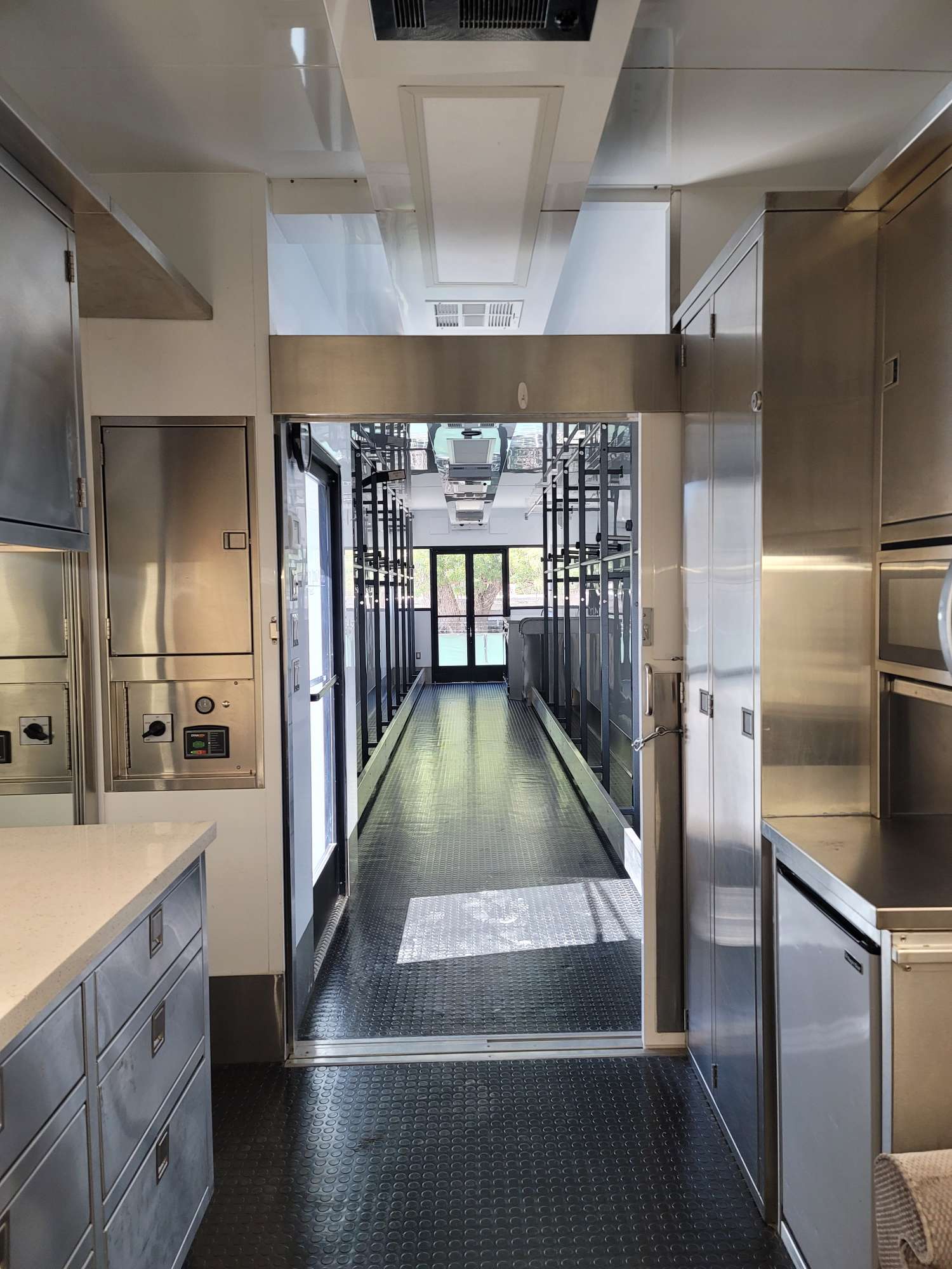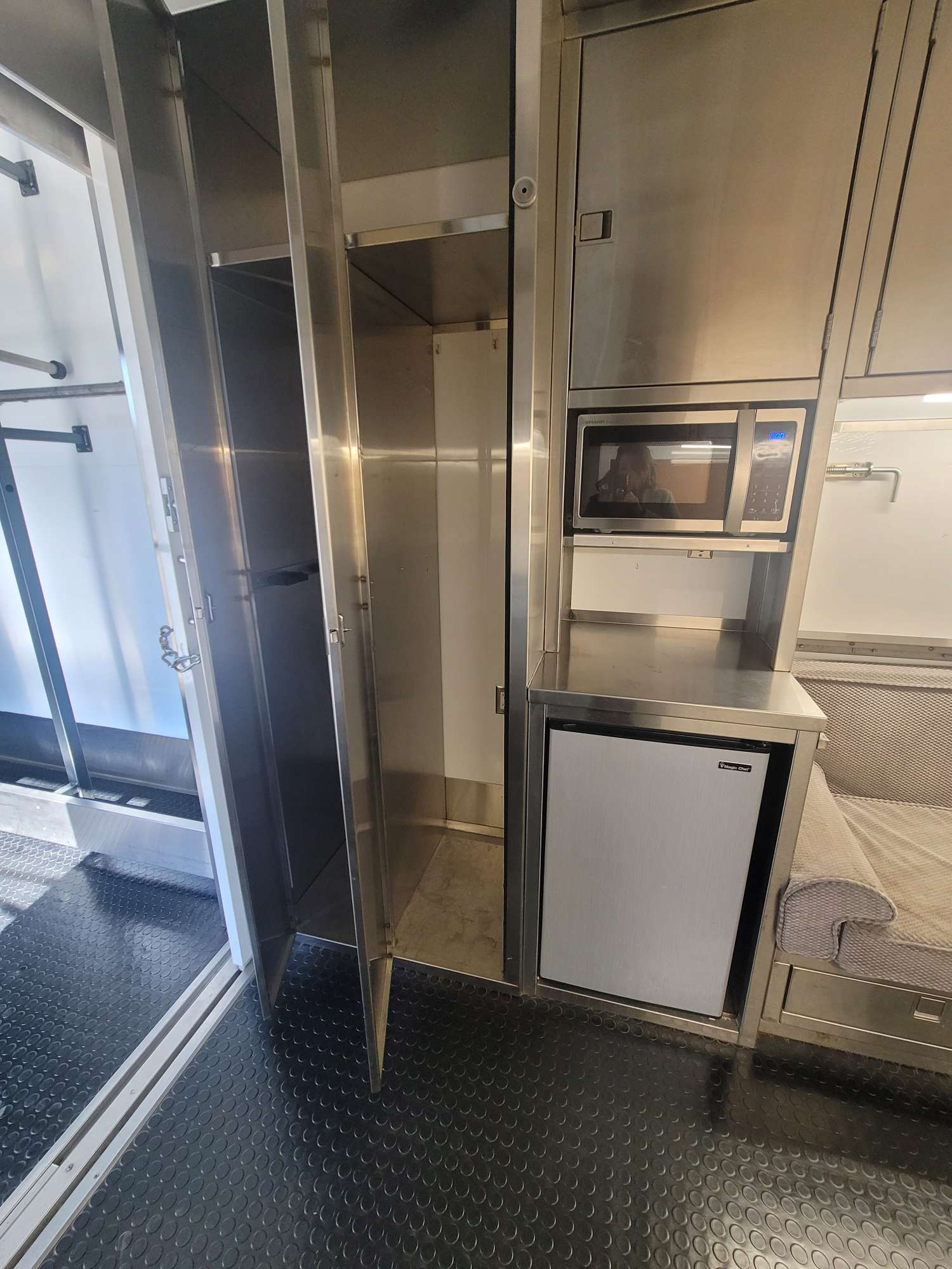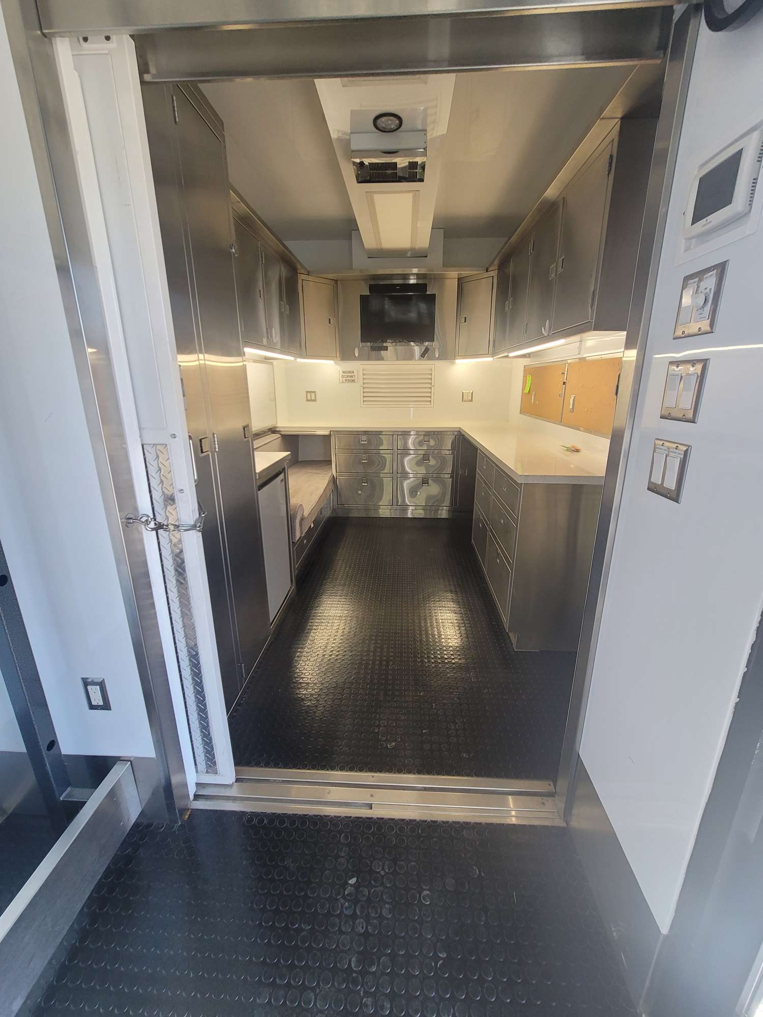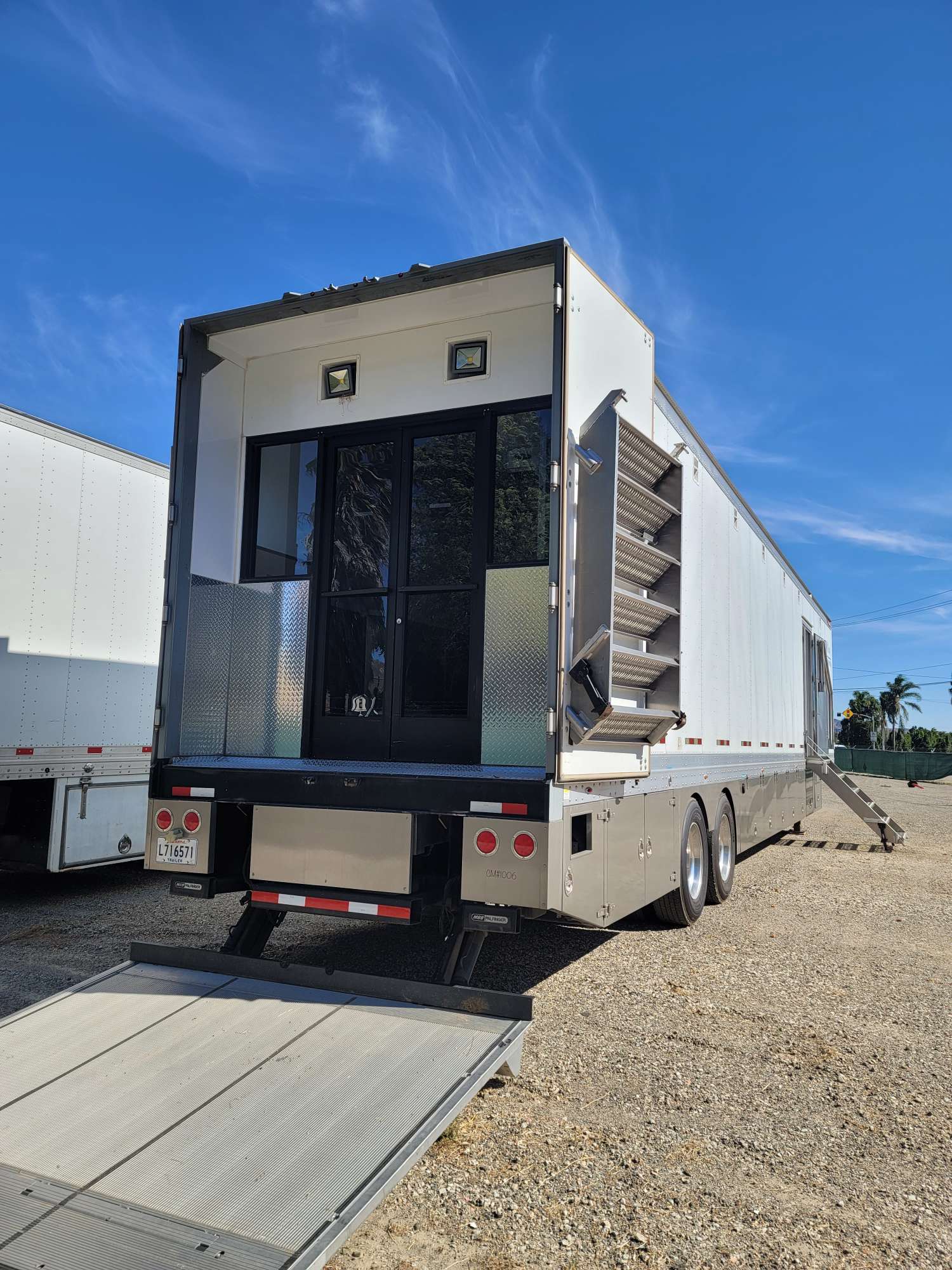 This vehicle is designed for Wardrobe Department use. The trailer includes: jockey box, storage cupolas, dual side and back loading. Trailer comes with a rear gate door, air-ride and automatics. This unit's workspace also includes custom storage and a built-in MP3 stereo system.