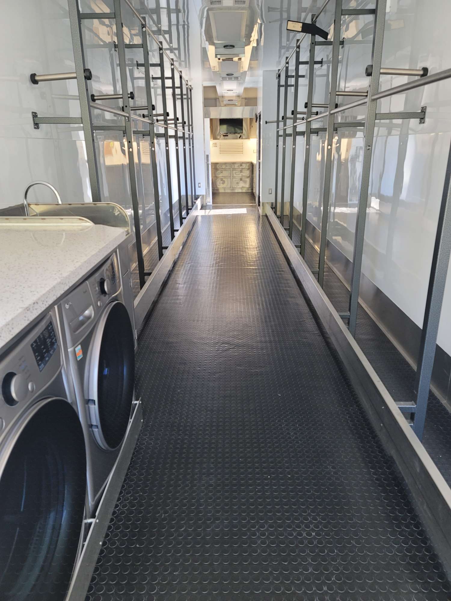 This wardrobe trailer is equipped with modular clothes racks, washer and dryer, desk seating and electrical generator to meet your production wardrobe department requirements.