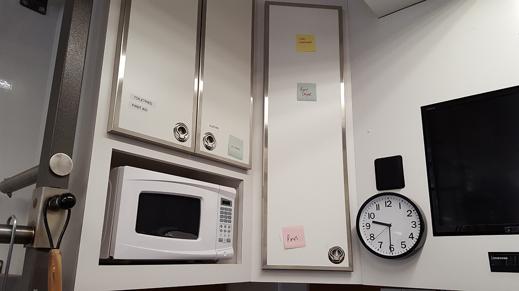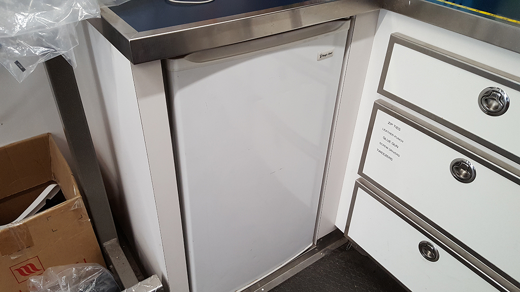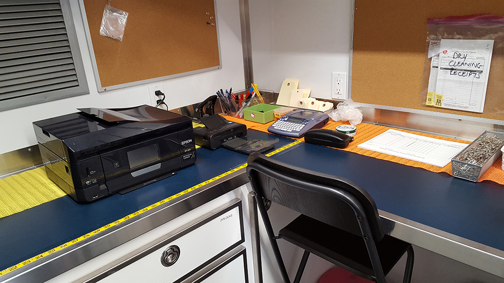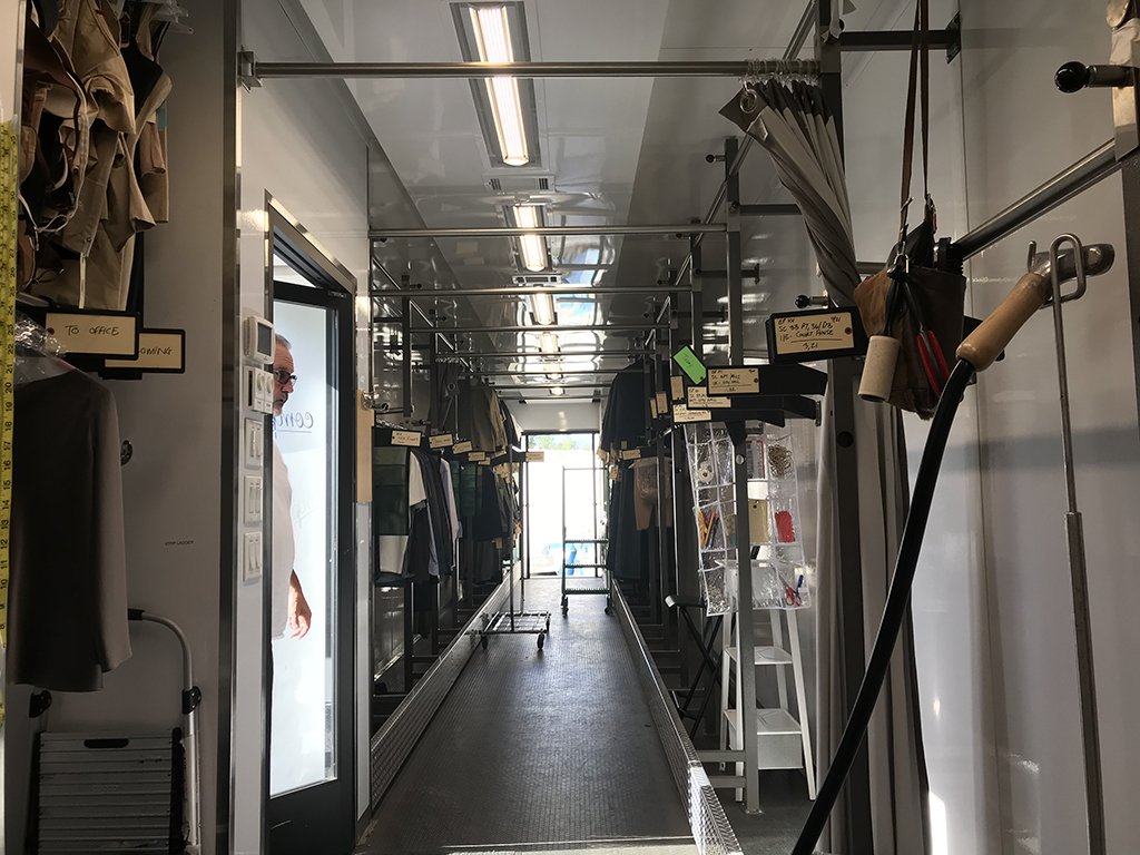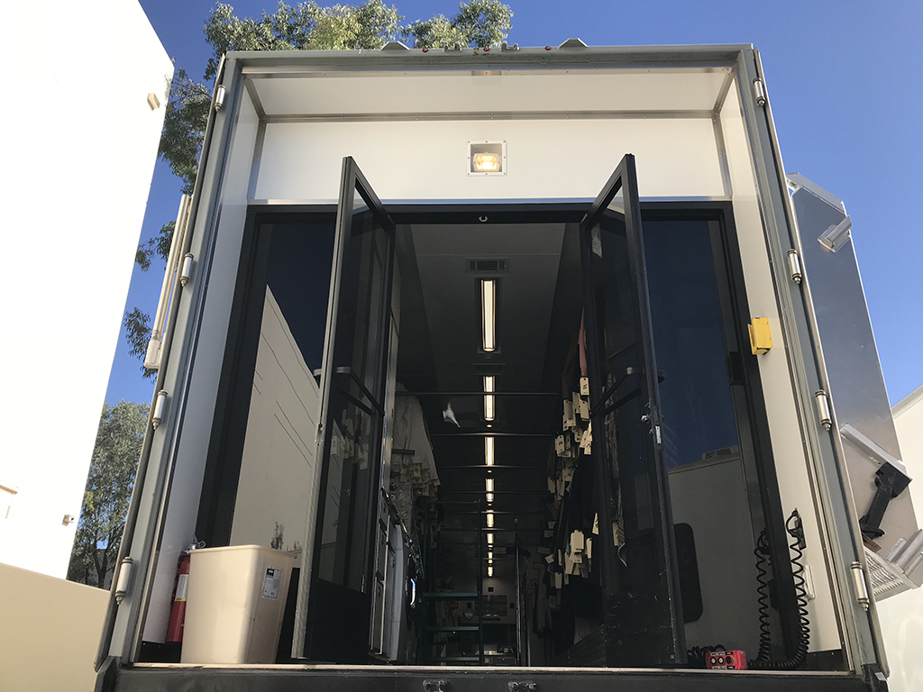 This vehicle is designed for Wardrobe Department use. The trailer includes: jockey box, storage cupolas, dual side and back loading. Trailer comes with a rear gate door, air-ride and automatics. This unit's workspace also includes custom storage and a built-in MP3 stereo system.
