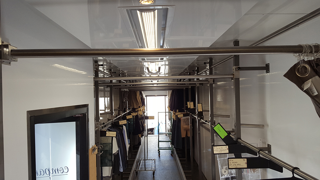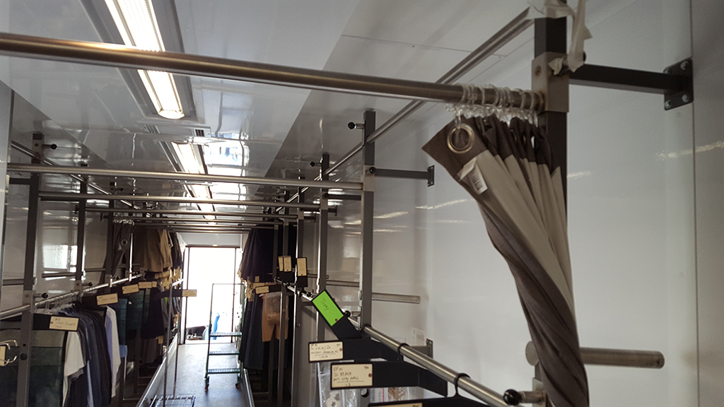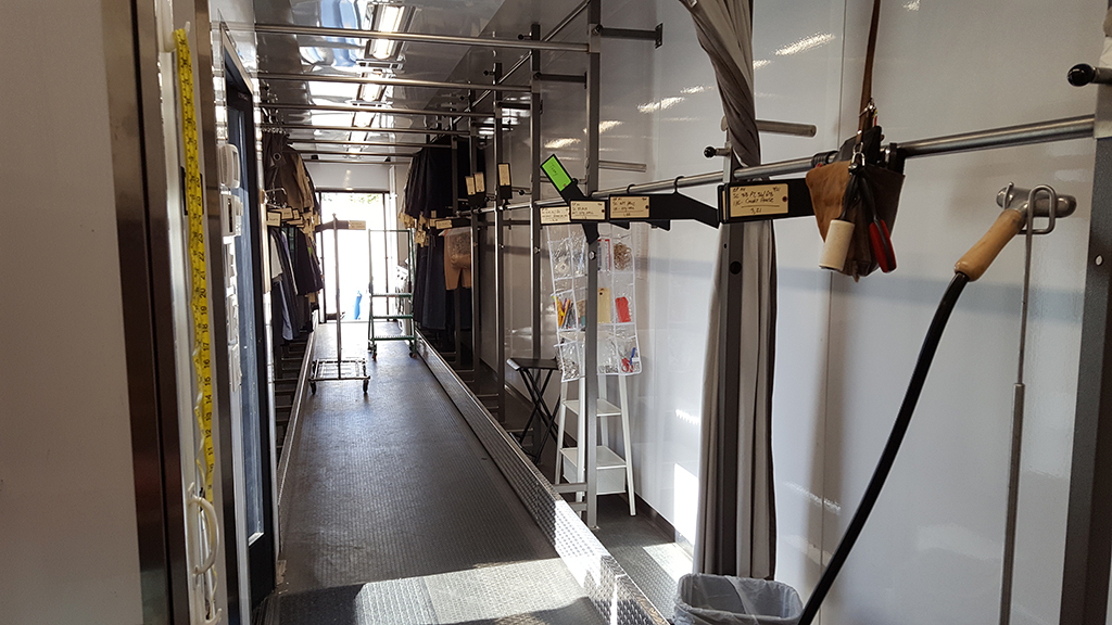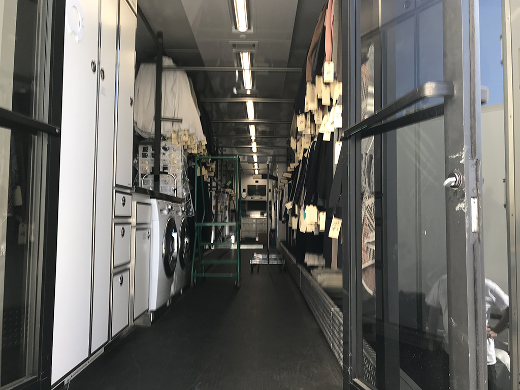 This wardrobe trailer is equipped with modular clothes racks, washer and dryer, desk seating and electrical generator to meet your production wardrobe department requirements.