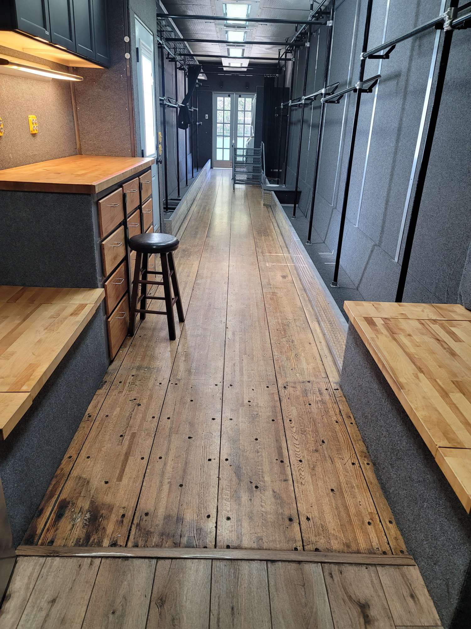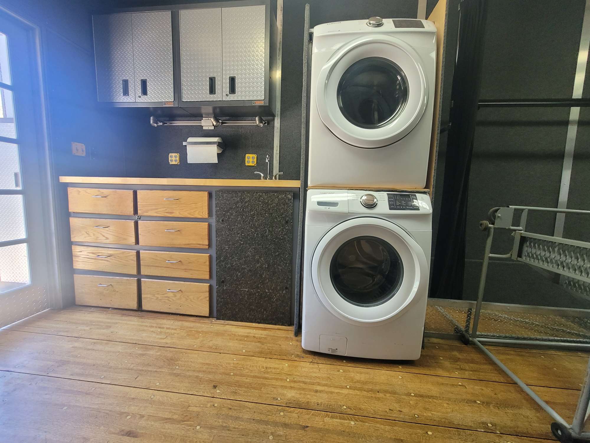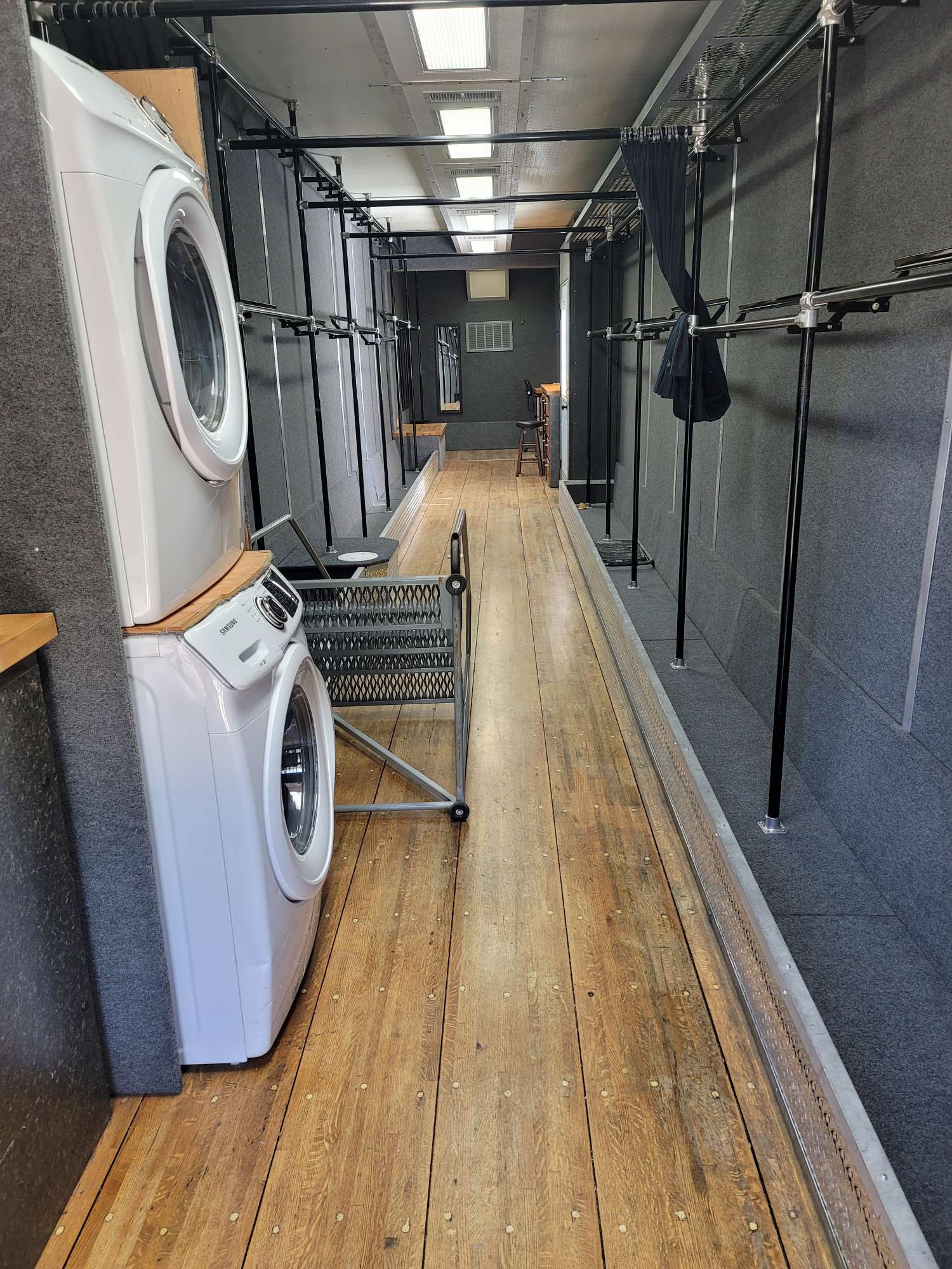 This wardrobe trailer is equipped with modular clothes racks, washer and dryer, desk seating and electrical generator to meet your production wardrobe department requirements.