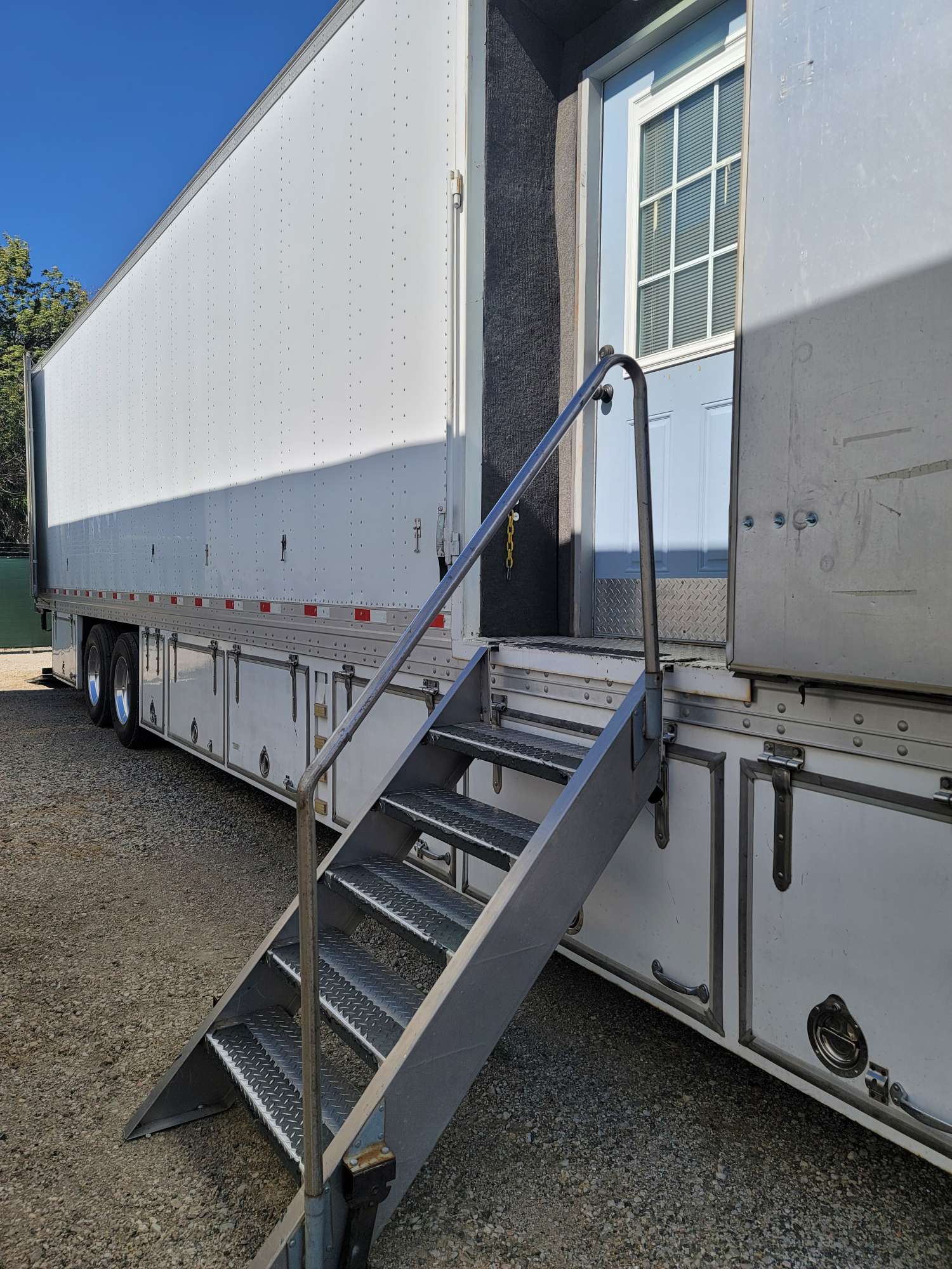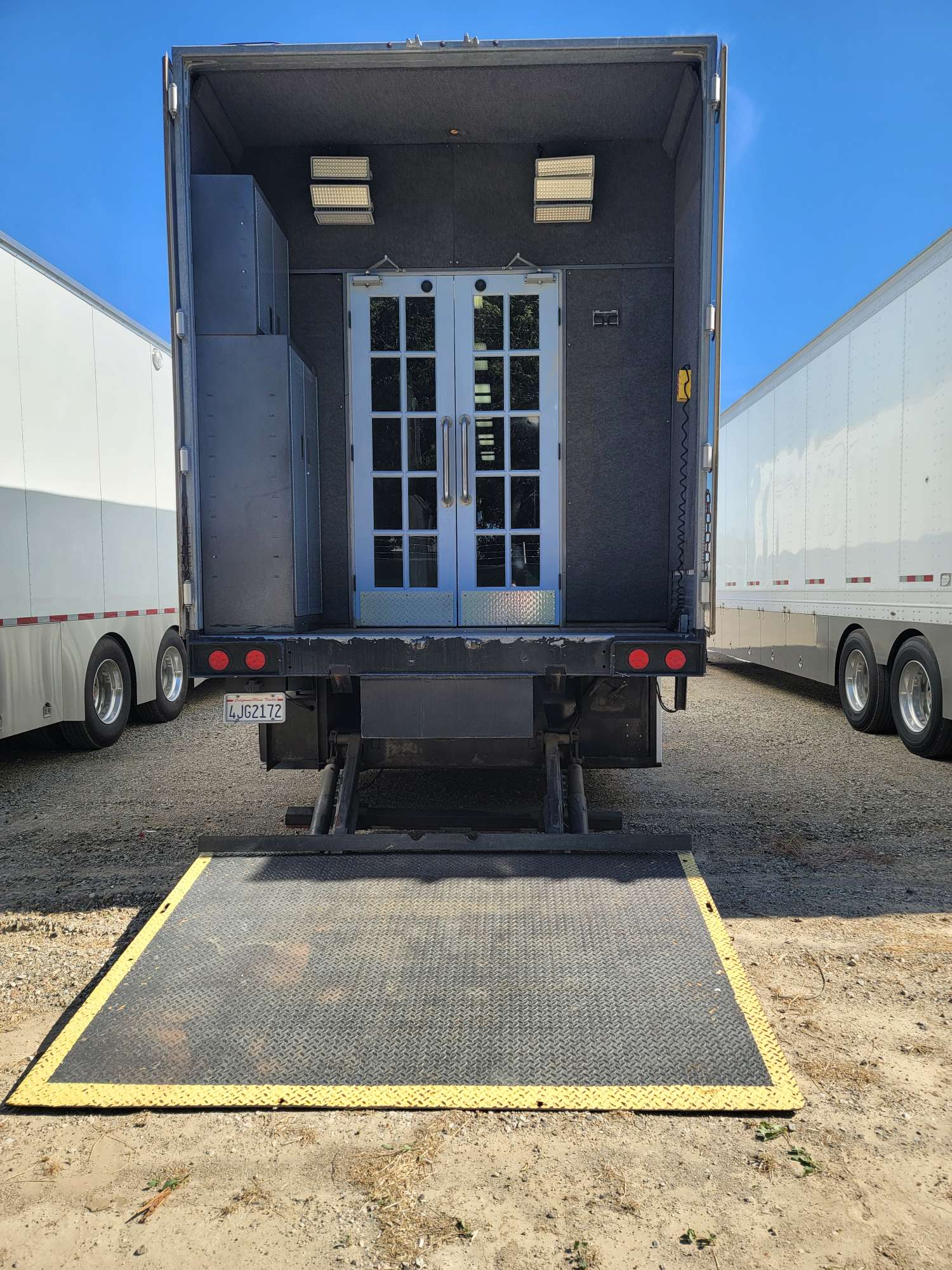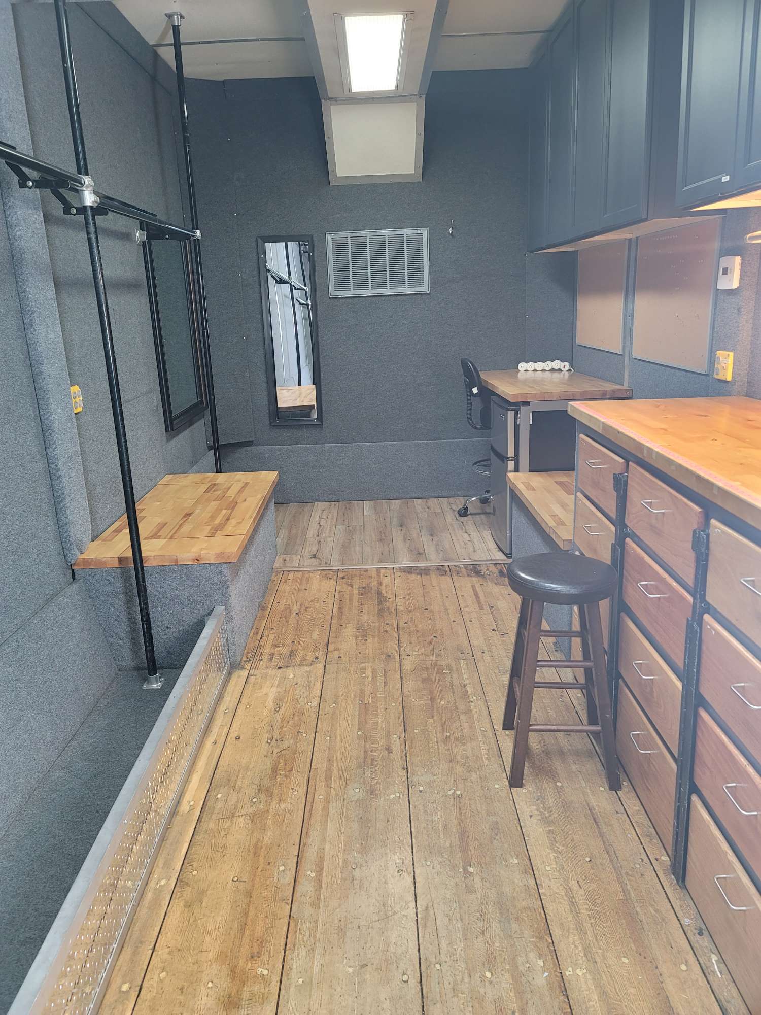 This vehicle is designed for Wardrobe Department use. The trailer includes: jockey box, storage cupolas, dual side and back loading. Trailer comes with a rear gate door, air-ride and automatics. This unit's workspace also includes custom storage and a built-in MP3 stereo system.