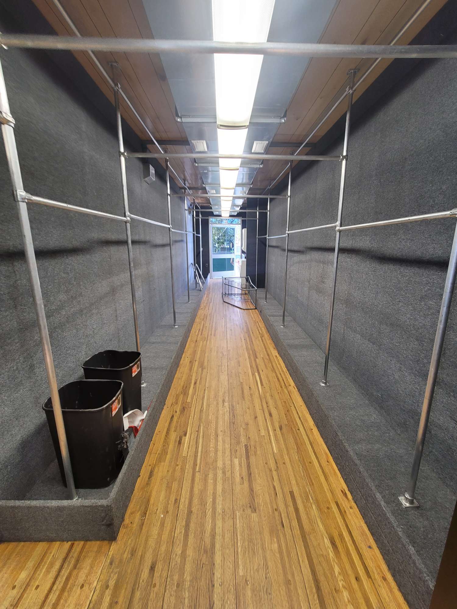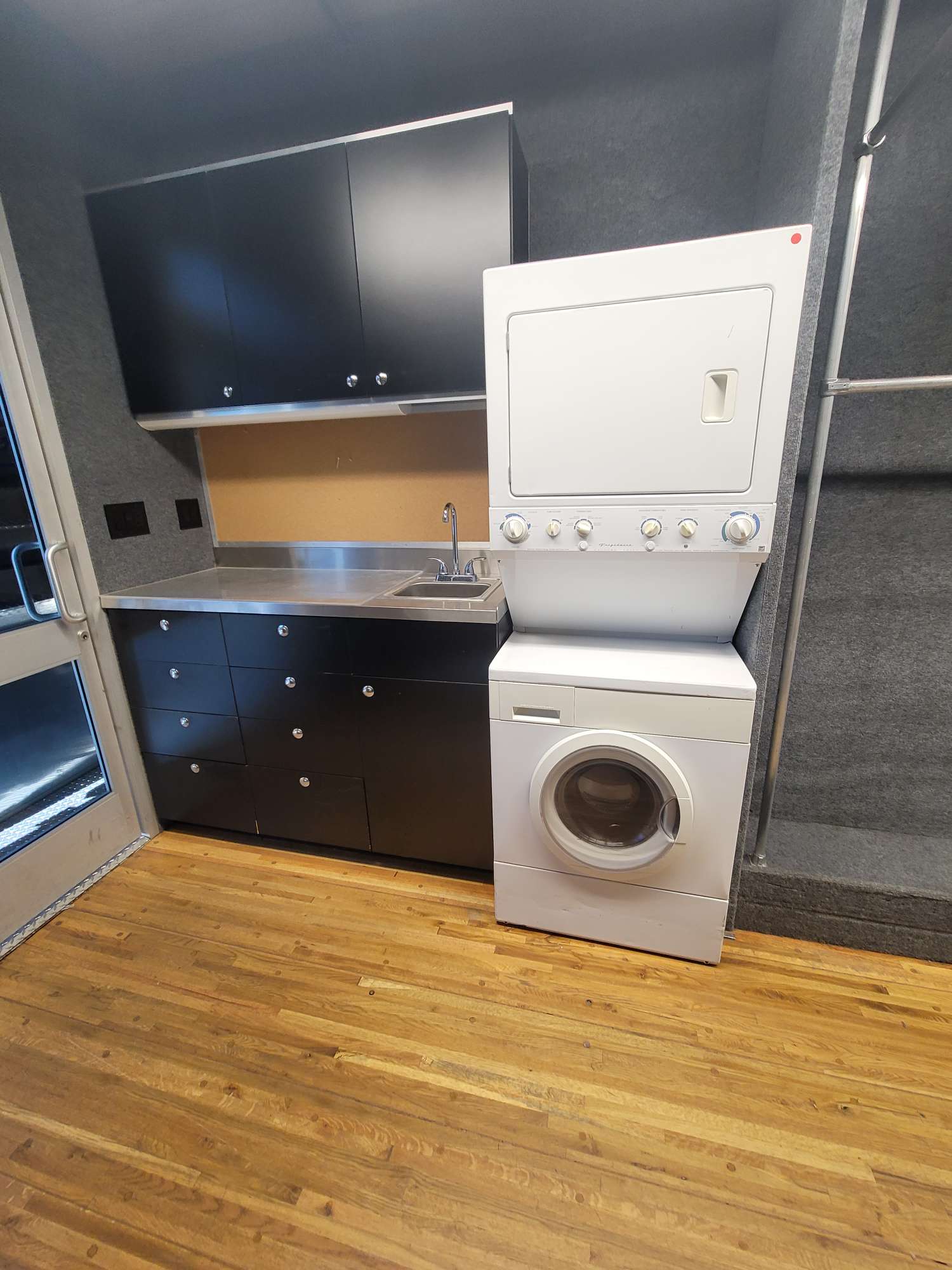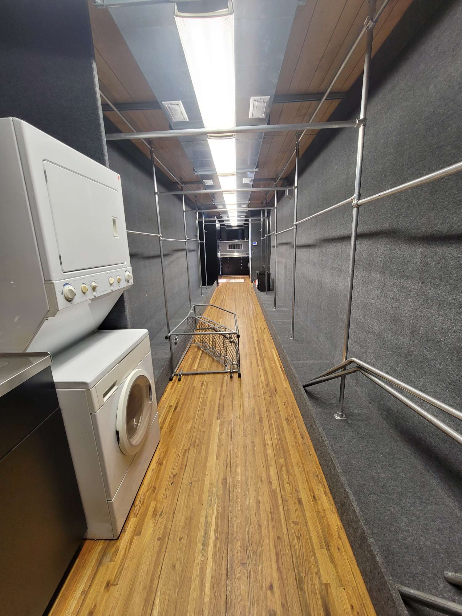 This wardrobe trailer is equipped with modular clothes racks, washer and dryer, desk seating and electrical generator to meet your production wardrobe department requirements.