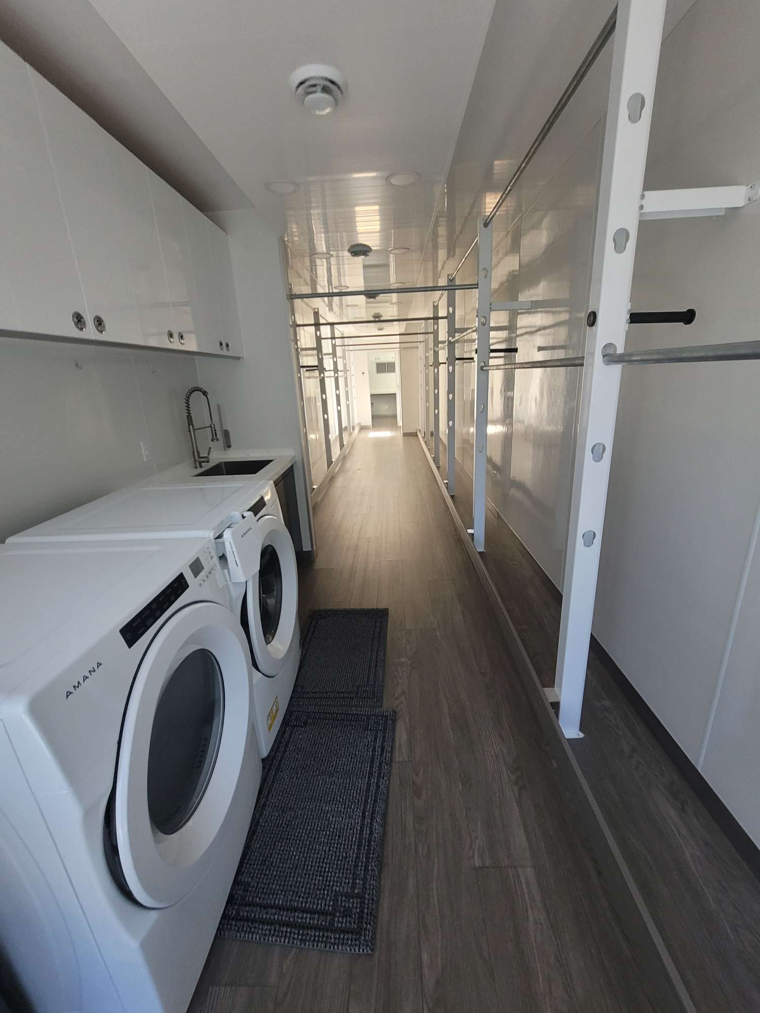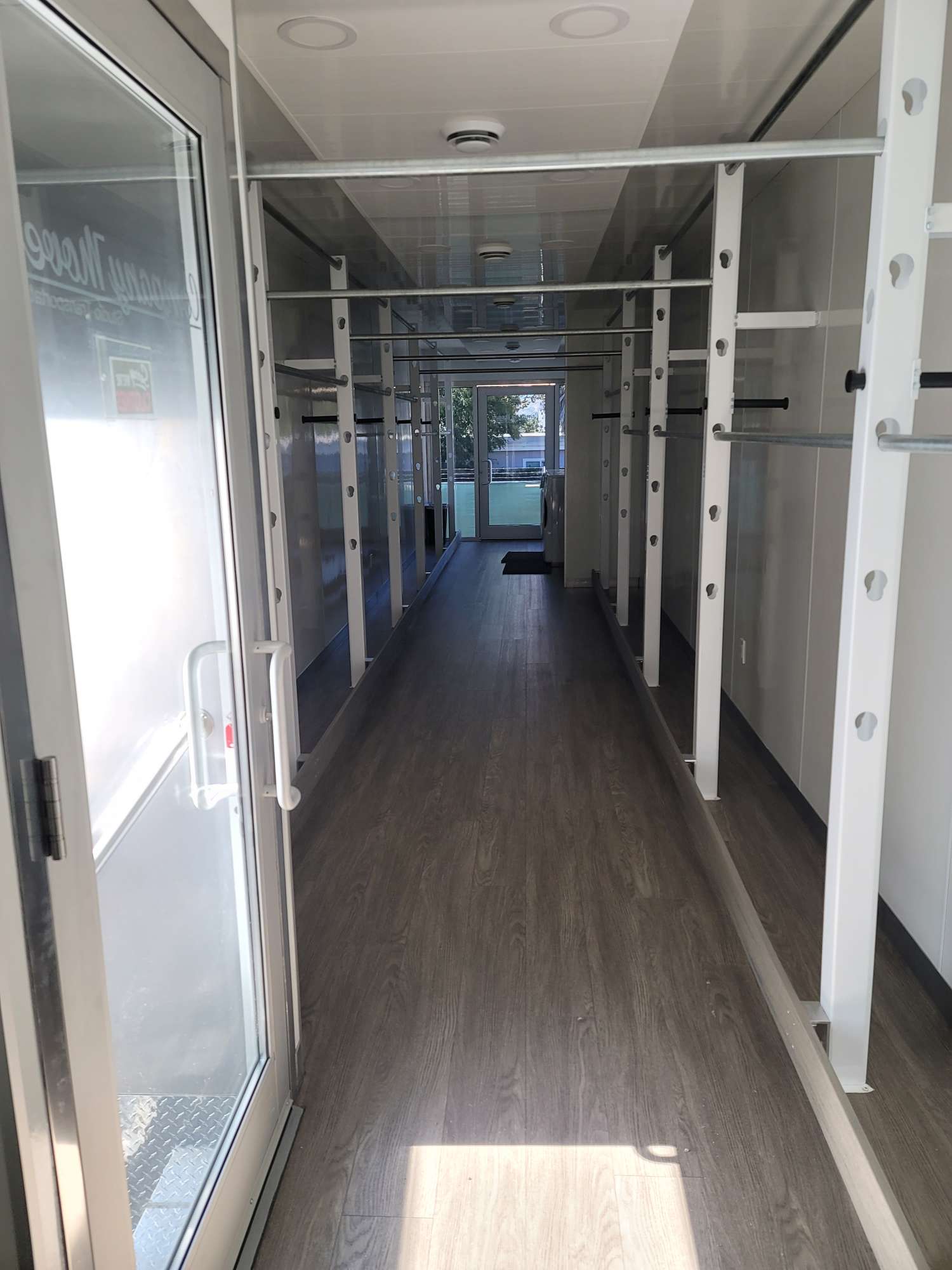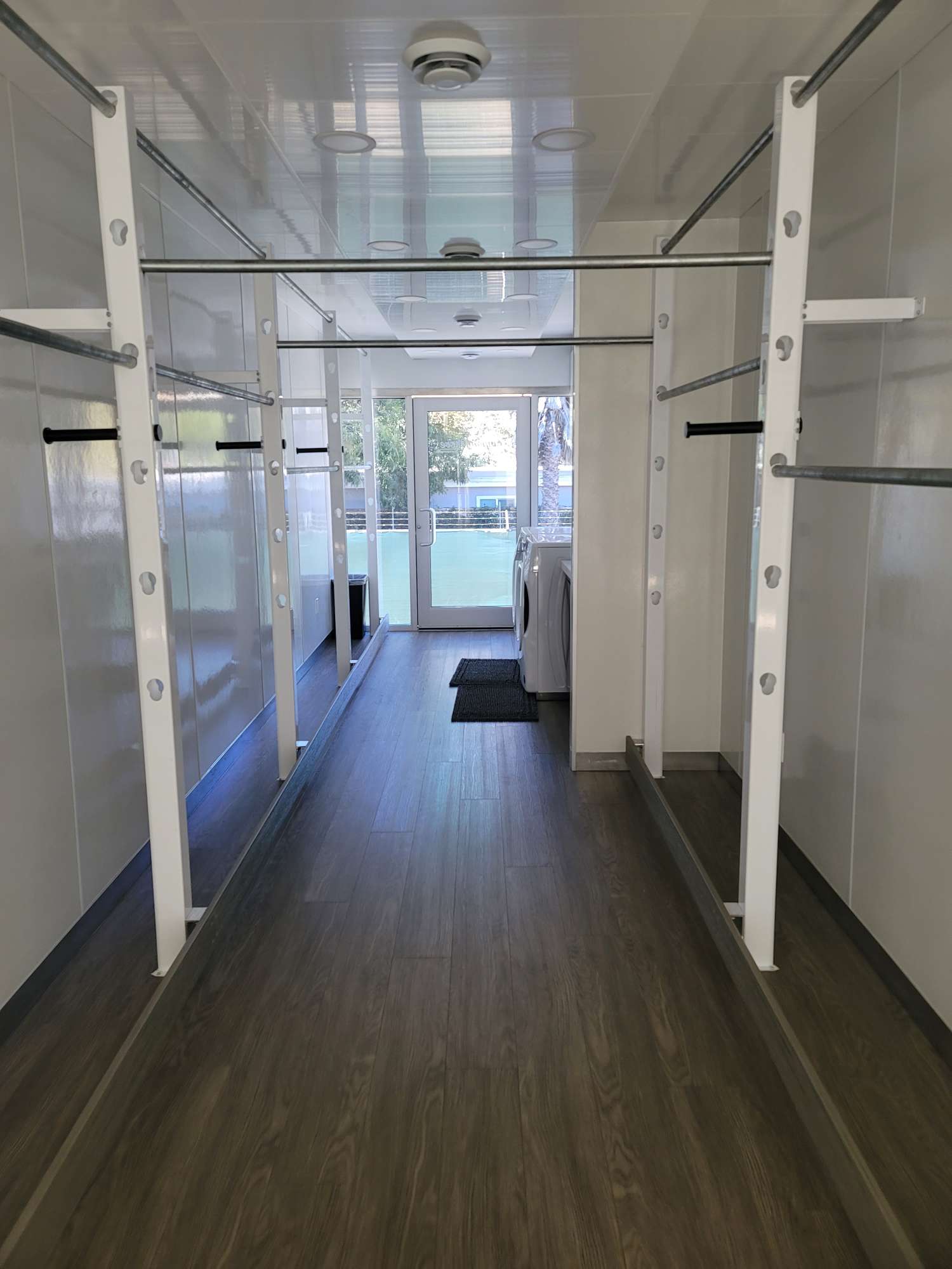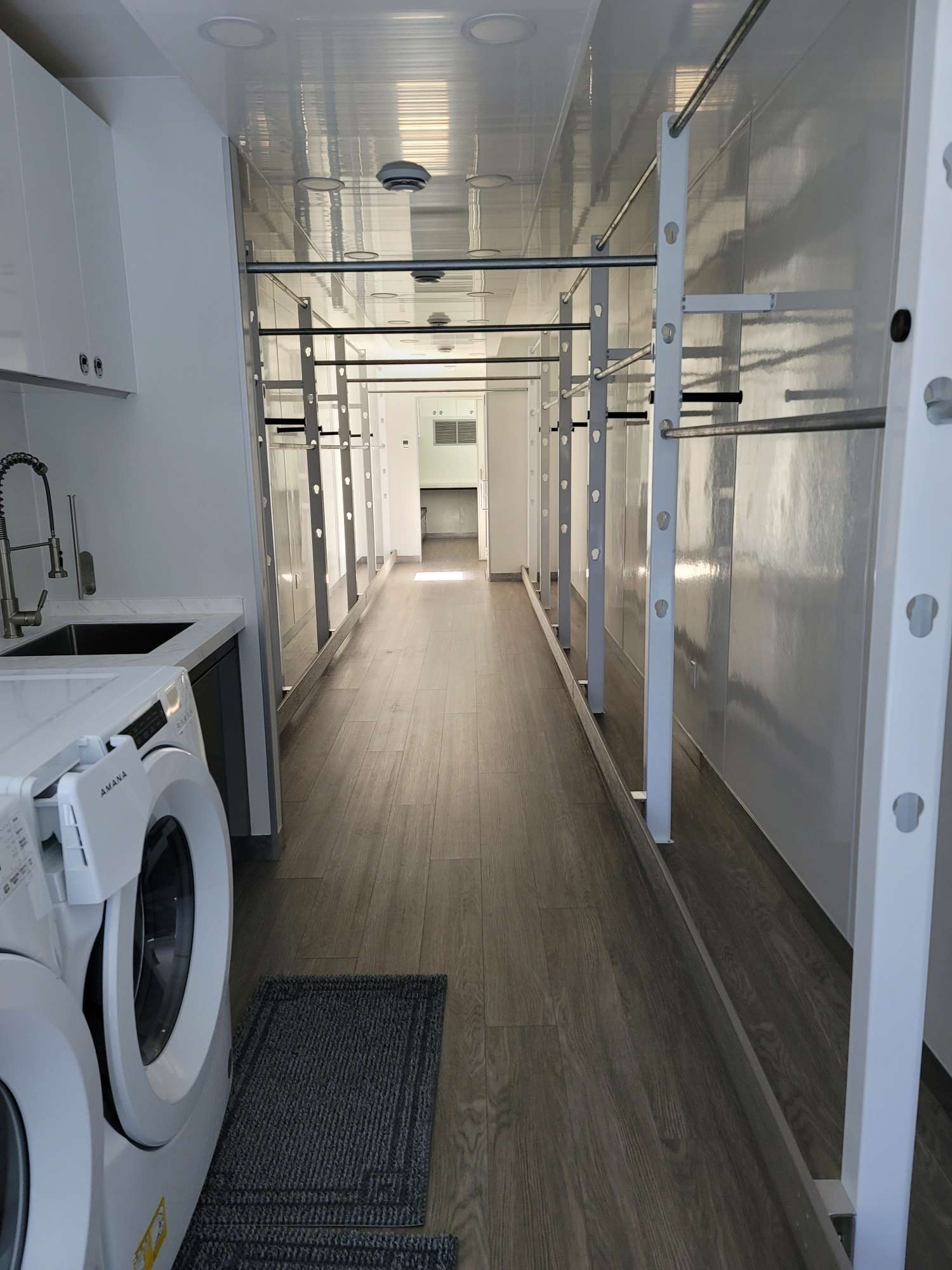 This wardrobe trailer is equipped with modular clothes racks, washer and dryer, desk seating and electrical generator to meet your production wardrobe department requirements.