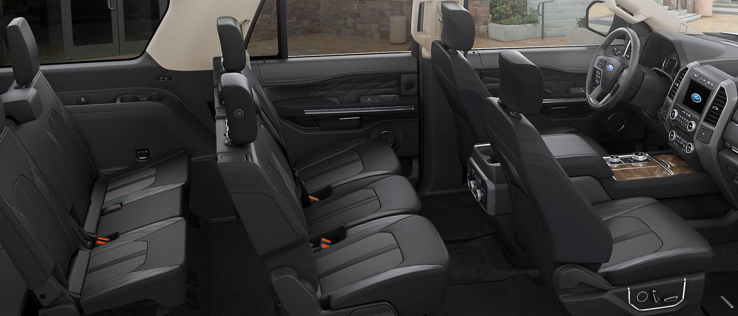 The Ford Expedition seats eight in three rows and features a turbocharged 3.5-liter V6 with 375 horsepower and 470 pound-feet of torque. The Expedition has 20.9 cubic feet of storage with full seating, 63.6 cubic feet with the third row hidden and 104.6 cubic feet with both the second and third rows stored.