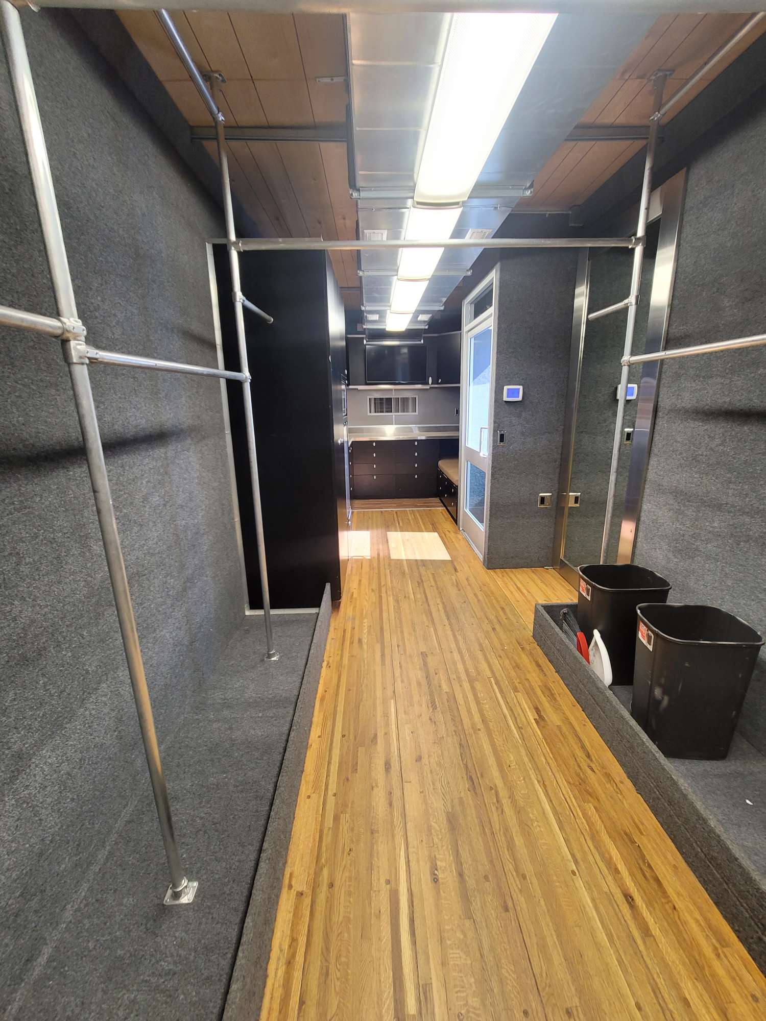 This wardrobe trailer is equipped with modular clothes racks, washer and dryer, desk seating and electrical generator to meet your production wardrobe department requirements.